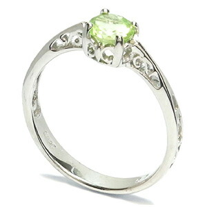 鮮やかな黄緑色に輝く約5mm程のペリドットが留められた、プラチナコーティングのシルバーリングです。