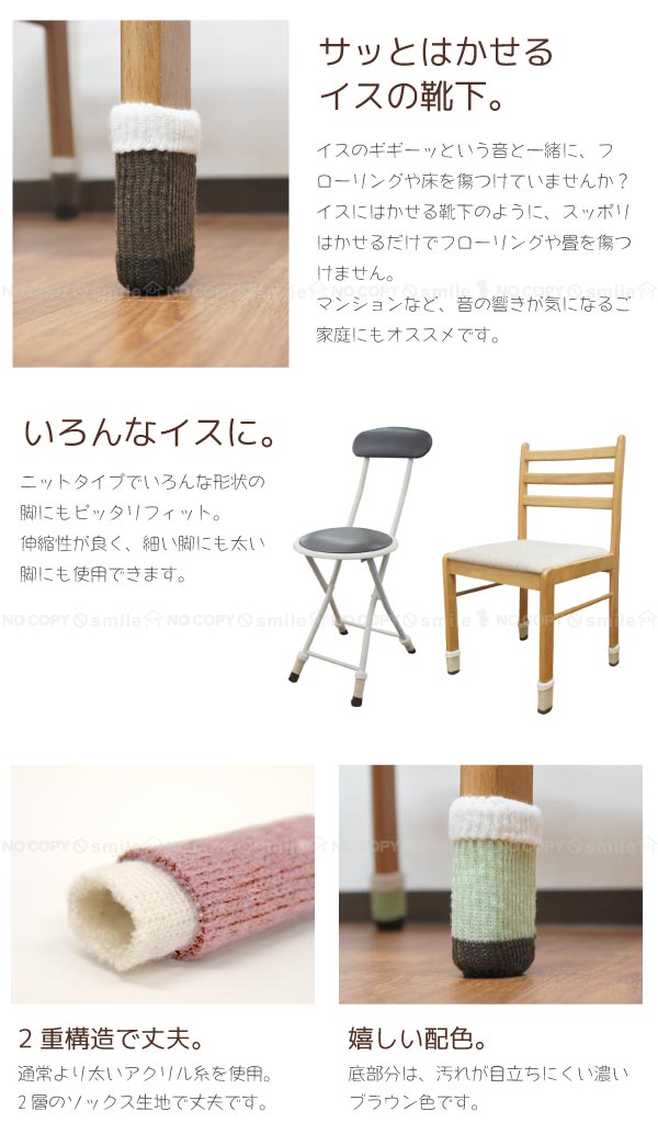 イスのギギーッという音と一緒に、フローリングや床を傷つけていませんか? イスにはかせる靴下のように、スッポリはかせるだけでフローリングや畳を傷つけません。 マンションなど、音の響きが気になるご家庭にもオススメです。 ニットタイプでいろんな形状の脚にもピッタリフィット。 伸縮性が良く、細い脚にも太い脚にも使用できます。