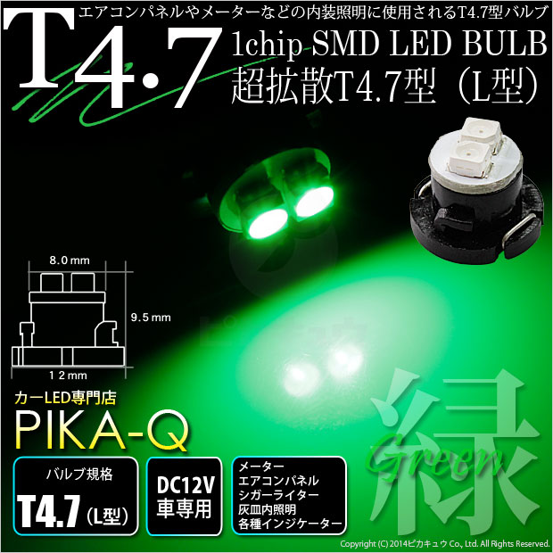 | ピカキュウ,LED専門店ピカキュウ,ledバルブ,LEDバルブ,LED,led,SMD,smd,T4.7,L型,メーターランプ,エアコンパネルランプ,シガーライターランプ,灰皿内照明,インジケーター用バルブ,DC12V車対応,1chip SMD LED,グリーン |