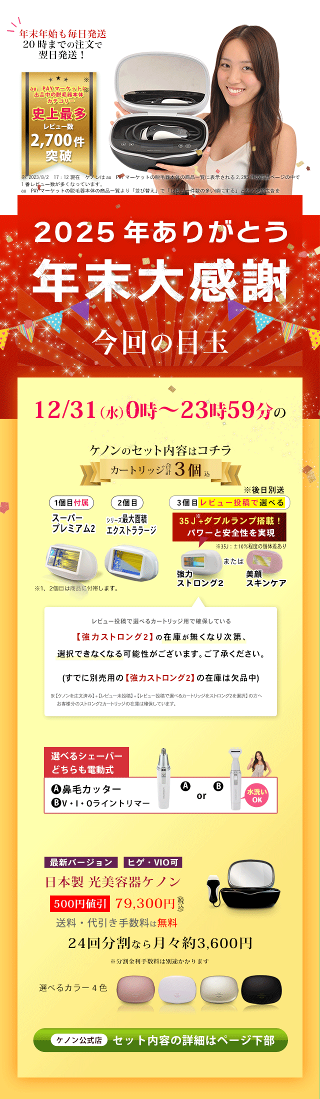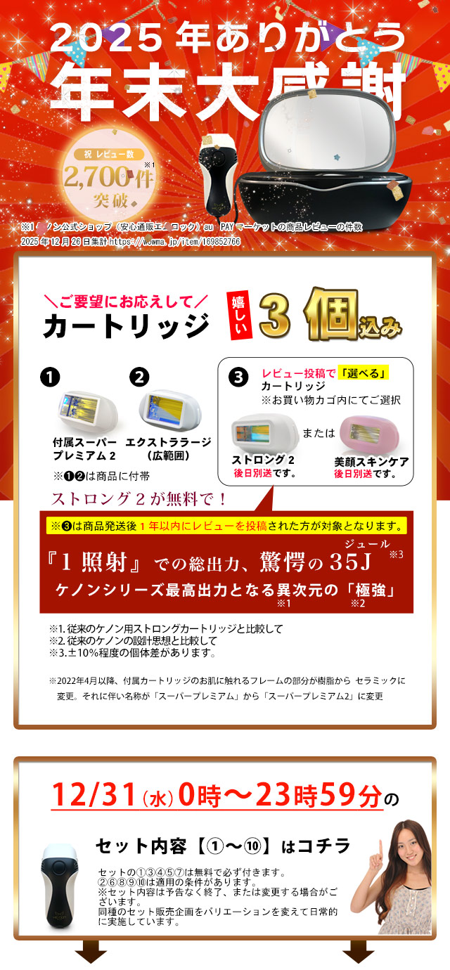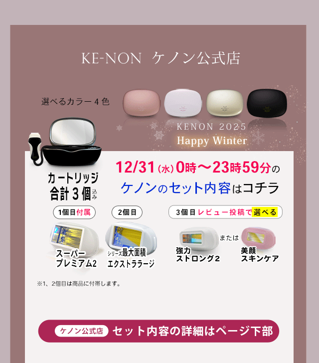 - ケノンの脱毛器の評判が良く購入しました。使い方も簡単で、これから効果が出るのが楽しみです!