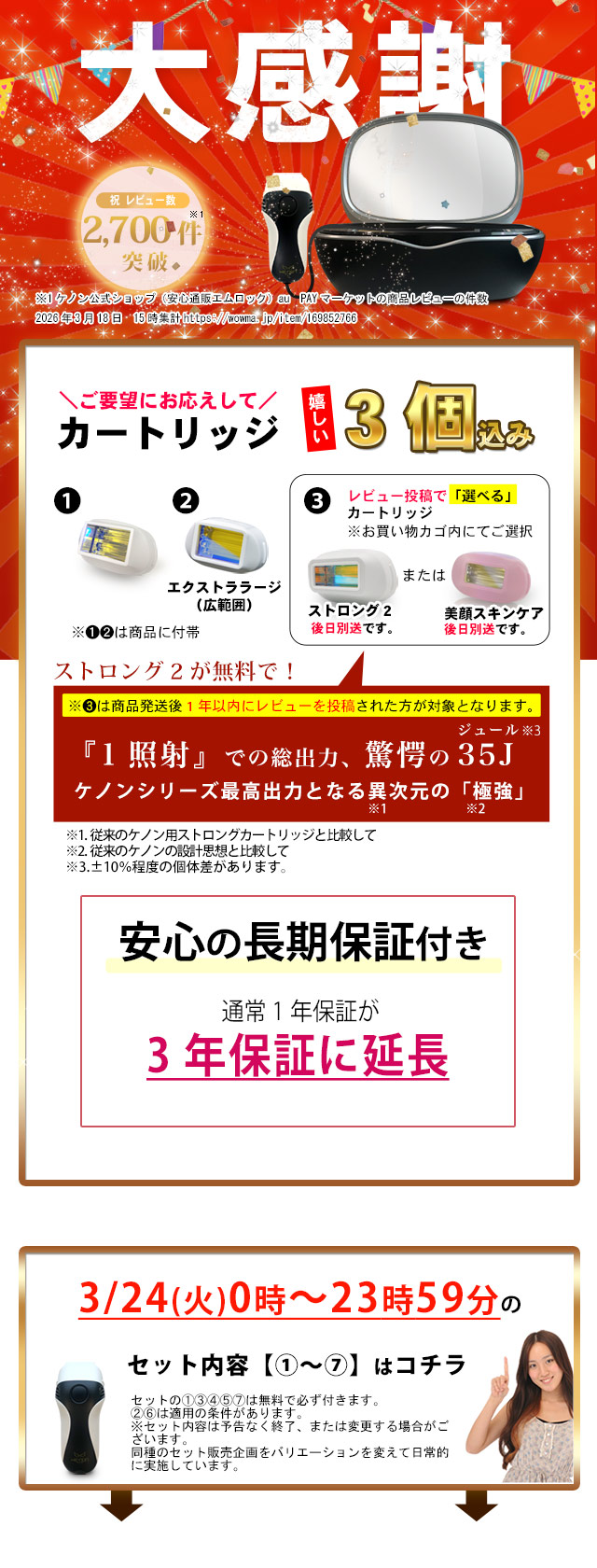 - 出荷番号 1008007660 1ヶ月と少し前に購入して、数回使用しましたが、大変満足しています。 過去に、エステでの光脱毛、クリニックでのレーザー脱毛を経験していますが、とにかく予約などが面倒で続きませんでした。 ケノンなら隙間時間に自分で納得いくまでできるので最高です。 何よりパワーが予想をはるかに上まわっており驚きました。 レーザーまでとはいきませんが、照射後一週間ほどで毛がポロポロと落ちて、その効果を実感しました。 他の家庭用脱毛器を購入したことはありませんが、ケノンを選び良かったと自分を褒めてあげたいです。 また、お店のレビューにも書きましたが、お電話した際、私の勘違いであったにも関わらず親切、丁寧に対応していただいた男性スタッフの方、本当にありがとうございました。 おかげさまで、大変気持ち良く買い物をすることができました。 本当にありがとうございました。 お店、商品ともにおすすめです。