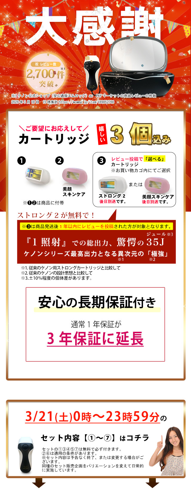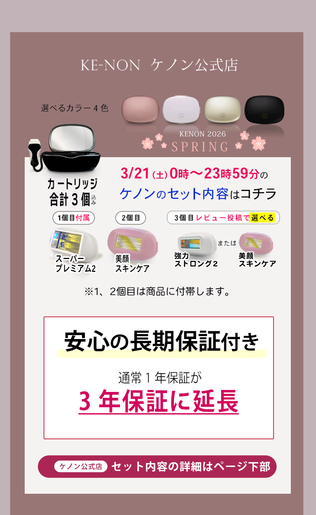 - 出荷番号 1008007660 1ヶ月と少し前に購入して、数回使用しましたが、大変満足しています。 過去に、エステでの光脱毛、クリニックでのレーザー脱毛を経験していますが、とにかく予約などが面倒で続きませんでした。 ケノンなら隙間時間に自分で納得いくまでできるので最高です。 何よりパワーが予想をはるかに上まわっており驚きました。 レーザーまでとはいきませんが、照射後一週間ほどで毛がポロポロと落ちて、その効果を実感しました。 他の家庭用脱毛器を購入したことはありませんが、ケノンを選び良かったと自分を褒めてあげたいです。 また、お店のレビューにも書きましたが、お電話した際、私の勘違いであったにも関わらず親切、丁寧に対応していただいた男性スタッフの方、本当にありがとうございました。 おかげさまで、大変気持ち良く買い物をすることができました。 本当にありがとうございました。 お店、商品ともにおすすめです。