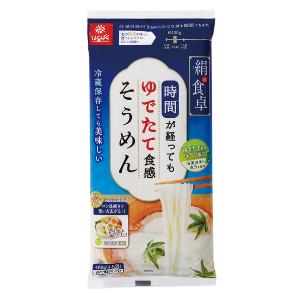 絹の白く細く強く華やかな食卓をイメージした「絹の食卓」は、いつもと違う、手軽な贅沢を味わっていただけるブランドです。喉越しがよく、時間が経っても茹で伸びしにくいのが特徴。コシ長持ちで、つるっとした食感です。また、帯を取る手間がいらないカンタン計量のパッケージで、取り出しがすっと出来、調理の手間を省くお手伝い。品質とおいしさで料理をする人を応援します。茹で時間2分
