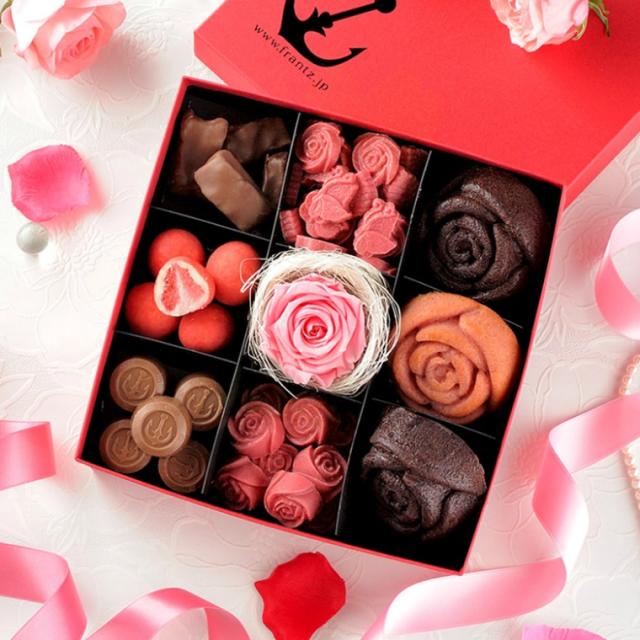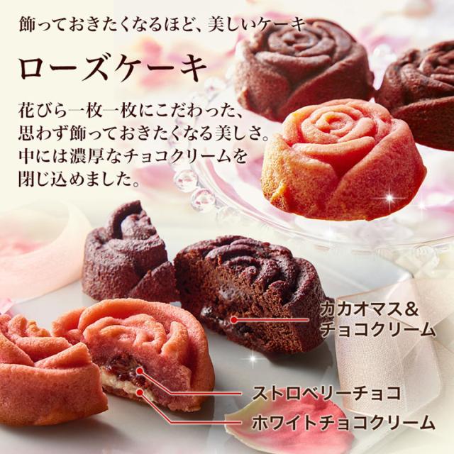 花びら1枚1枚まで繊細に再現した2色のローズケーキ、可憐なローズや蝶をかたどったチョコレート、甘酸っぱい苺のフルーツショコラに、プレミアムな濃厚ミルクチョコレート、シナモンが香るやわらかな食感の林檎チョコ。それぞれに個性豊かな7種のスイーツとローズのプリザーブドフラワーが美しく並んだ、宝石箱のようなスペシャルギフトです。