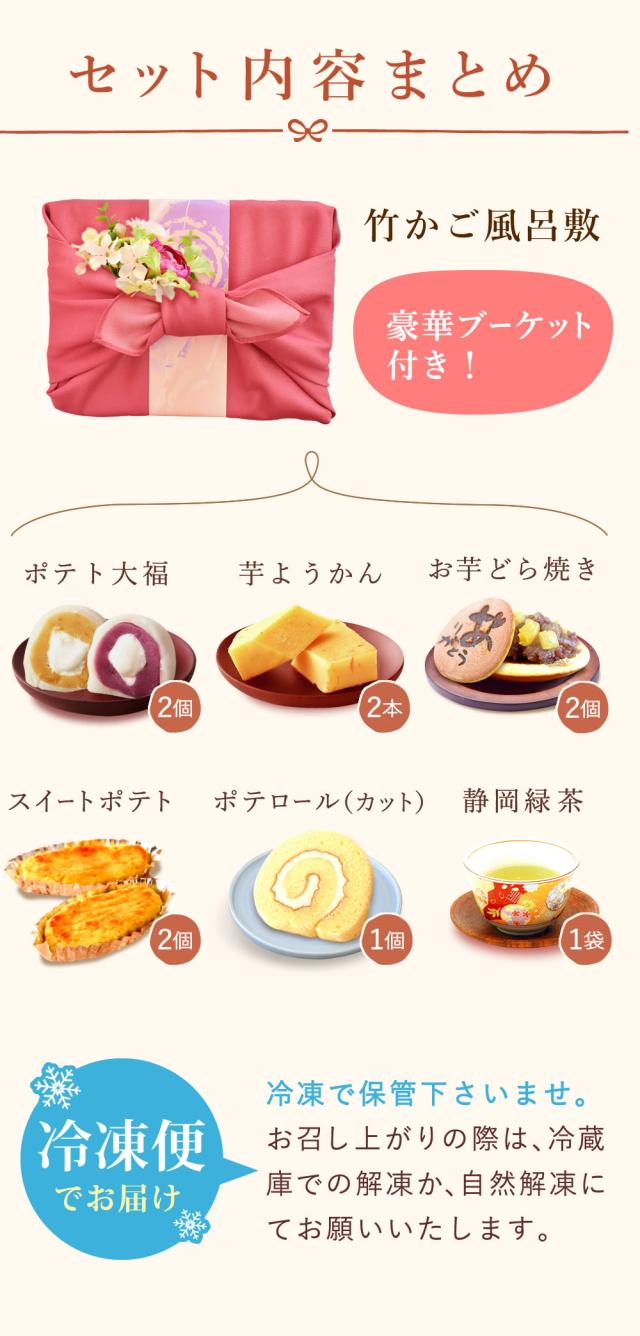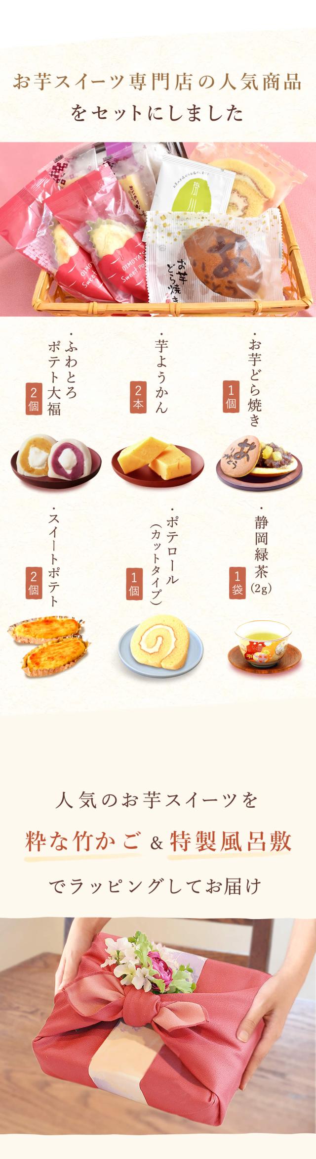 | 商品内容 | ○ふわとろポテト大福2個 ○お芋どら焼き…2個 ○ポテロールカット 1個 ○スイートポテト2個 ○芋ようかん 2個 ○静岡緑茶(静岡県掛川産) 2g |