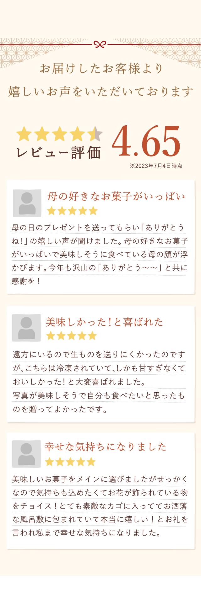 - 自分の両親に渡しました。 様々な商品がありますが、両親共健在で甘い物好きなので2個づつ以上入ってる物って(取り合いにならないよう(笑))案外少なくて迷いましたが、とても喜んでくれました。 80代半ばの...