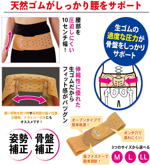 本品は天然ゴムを使用し、適度な強さで伸縮を保ち、腰部を軟らかく保護します。天然生ゴム100%使用!長時間着けてもズレにくい。10cmの細巾カットで腰骨に当たるように使用するので腹部の圧迫感はありません。スポーツ・レジャーに、重い荷物の運搬に、長時間の座り仕事に、看護・介護に、ドライバーにお奨めです。