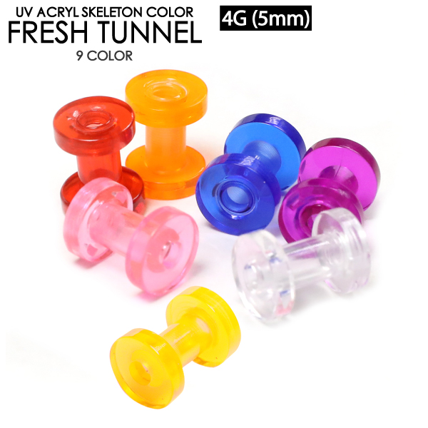 【メール便対応】UVアクリル スケルトン フレッシュトンネル 4G(5mm) 透明 ネジ式で開閉 アイレット イヤーレット ボディーピアス ボディピアス ロブ 4ゲージ(5ミリ)┃
