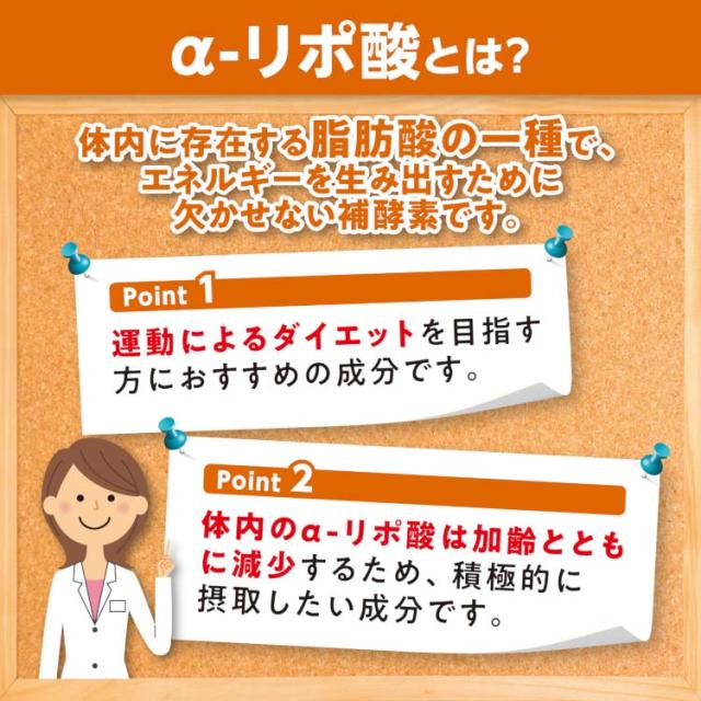 | チオクト酸(α-リポ酸)(国内製造)、食用精製加工油脂/シクロデキストリン、ゼラチン、微粒二酸化ケイ素、酸化防止剤(抽出ビタミンE)、着色料(カラメル、酸化チタン) |
