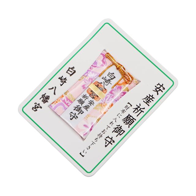 白崎八幡宮の御祭神の一柱でおられる神功皇后は、妊娠中おなかに帯を巻いて戦に出て無事安産したという神代の 言い伝えがあります。白崎八幡宮は八幡様の中でも特に霊験あらたかで、無事安産で健やかな緑子(みどりご)が産まれると自然に広まり、多くの方々が御神徳をいただこうと戌の日に来宮されています。【サイズ】縦5cm横3.1cm千代紙の袴がかかったカードタイプのお守りです。お財布などに入れてお持ちいただけます。