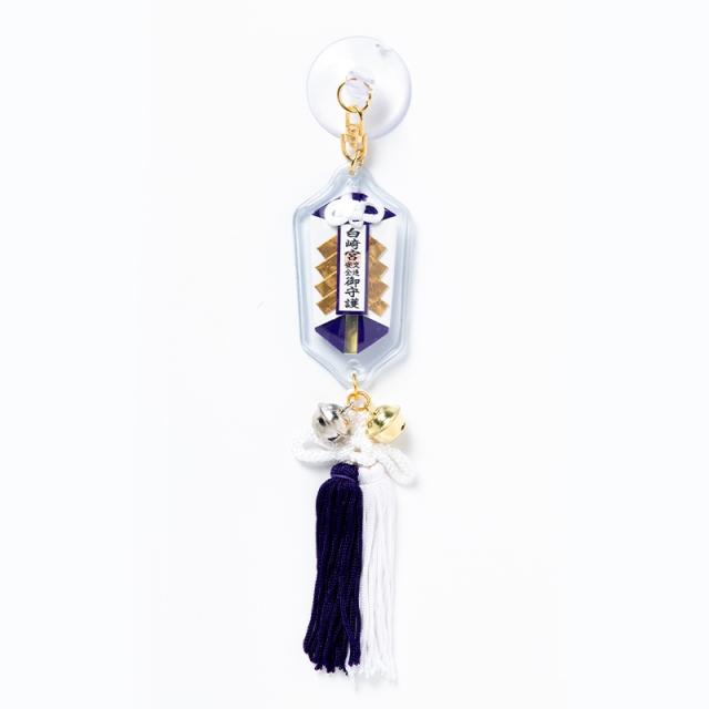 白崎八幡宮は、交通の神として領民の方々からの尊崇の念が深く江戸時代には、海上の守護神として城主吉川氏はもちろんのこと他国の大名でさえ、海上に船を停めて礼拝されるほどでした。時代の流れと共に人々の交通手段も船から鉄道、鉄道から車へと移り変わり、今では多くの方々が車(自動車清め祓い)の祈願をされ白崎の大神様のご神徳をいただこうと来宮されています。【サイズ】長さ20cm横4cm 【カラー】紺金幣が綺麗なのし型の房付き吸盤お守りです。