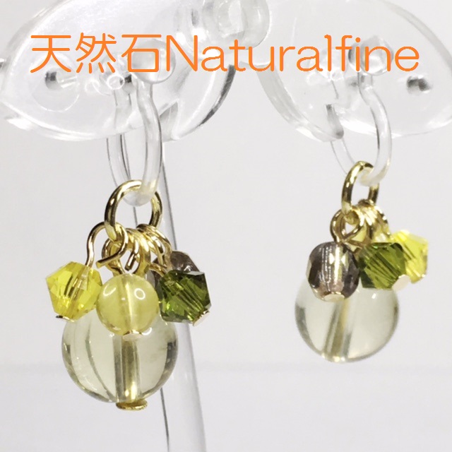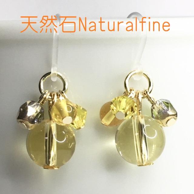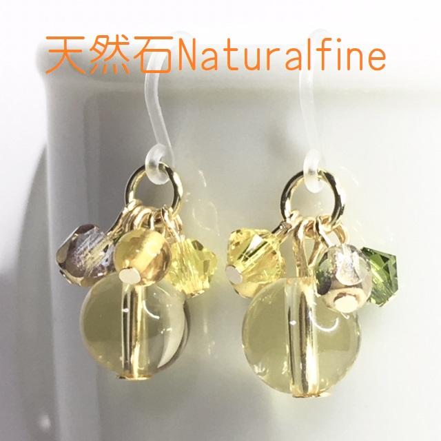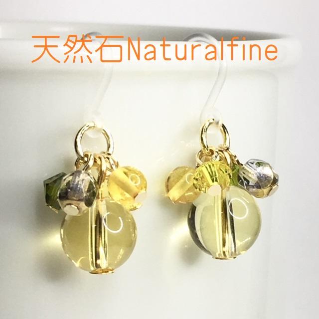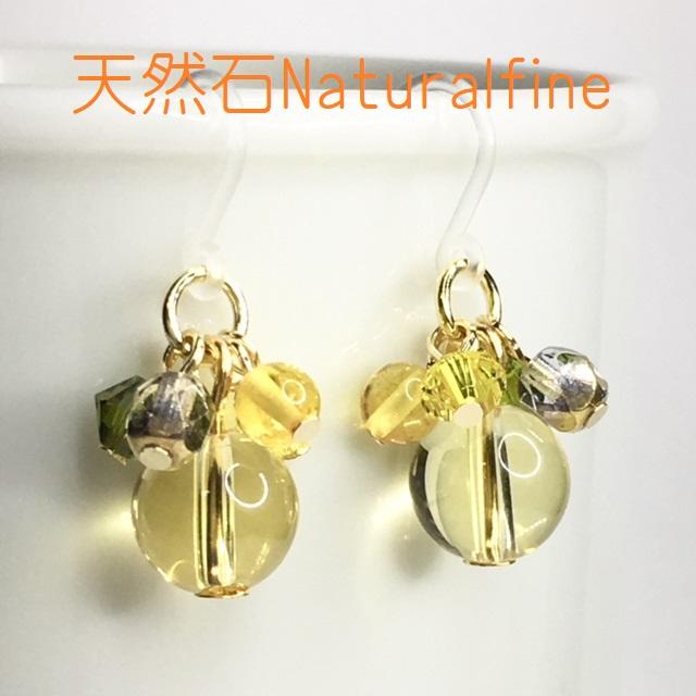 こちらは、パワーストーンのレモンクォーツと天然琥珀とスワロフスキーそしてチェコビーズを組み合わせたピアス(イヤリング)です。