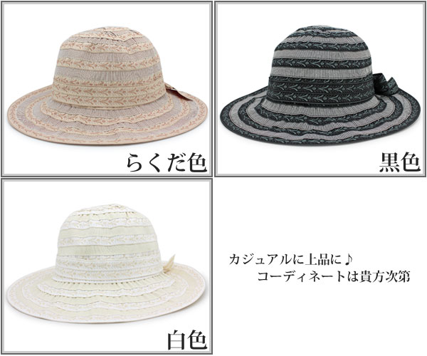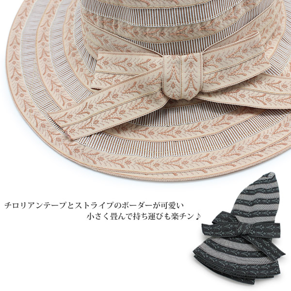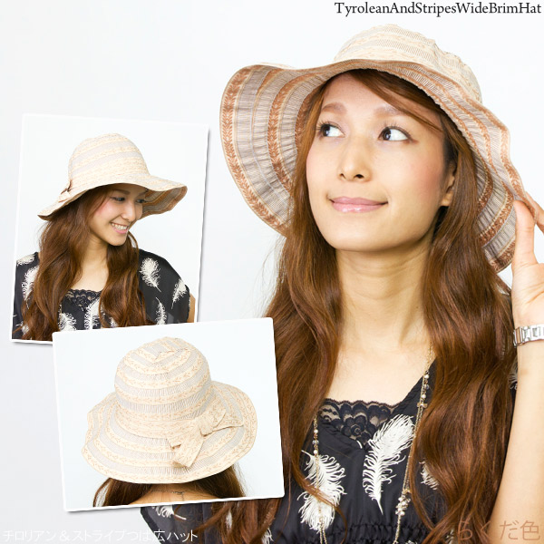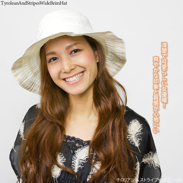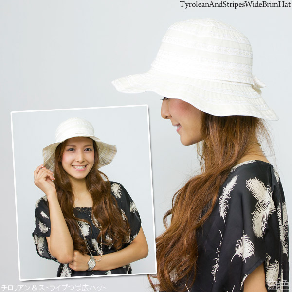 帽子 レディース [メール便可] つば広 ハット 春夏 UV対策 小顔効果 HAT 女優帽 / チロリアン&ストライプつば広ハット