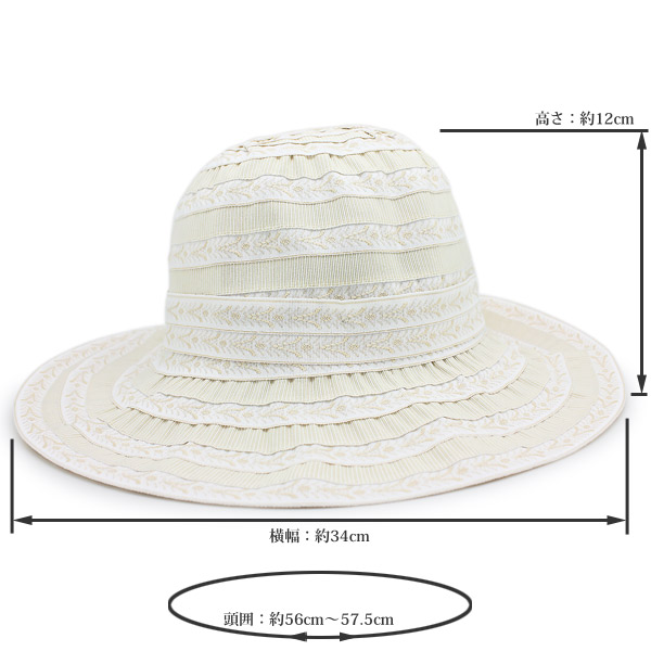 サイズ表記 約57.5cm(頭囲:約54〜57.5cm、高さ:約12cm、横幅:約34cm[つばも含む]、つばの長さ:約9cm)