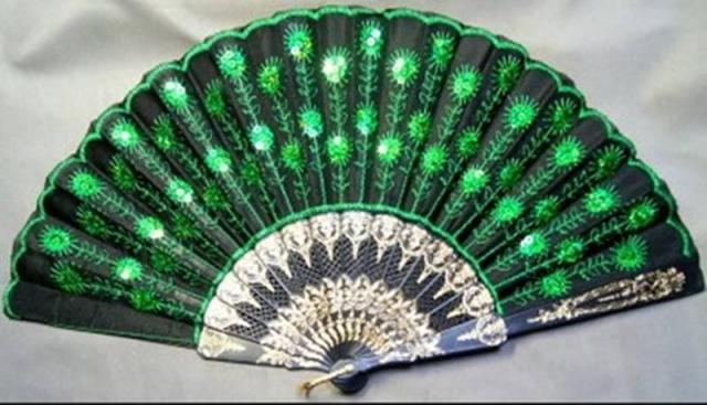 スパンコール付き 刺繍扇子(緑色刺繍+黒) 【新入荷色】