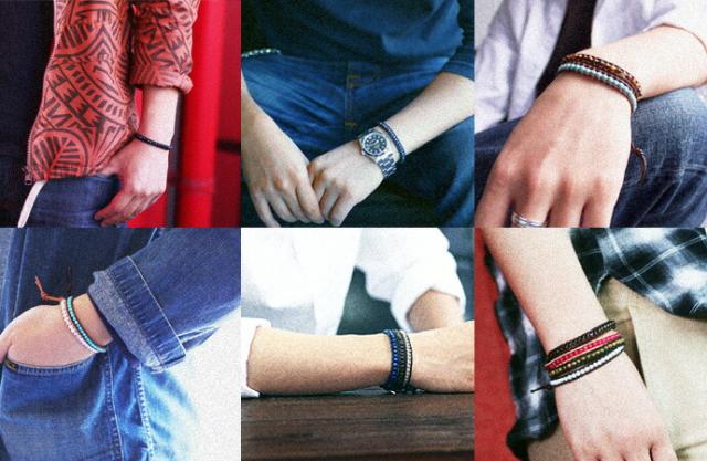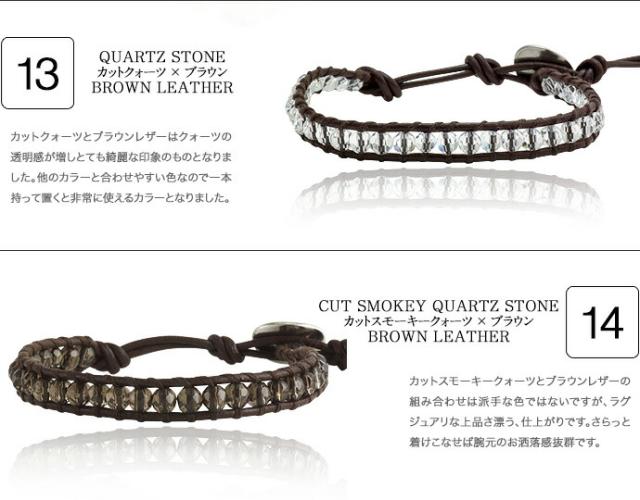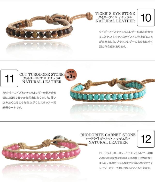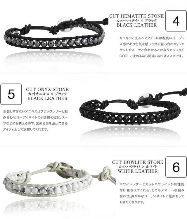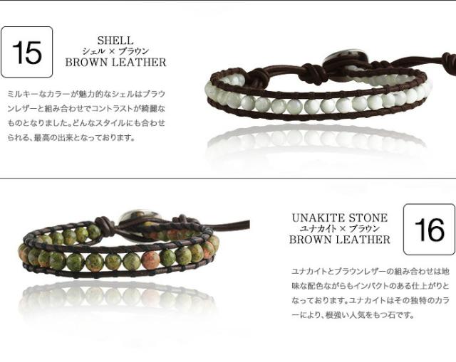 ハウライト、ヘマタイト、ターコイズ、アメジスト、ユナカイト、タイガーアイ、オニキス、クォーツ、ロードライト、ターコイズ、ラピスラズリ、スモーキークォーツ、シェル、レザー(牛革)