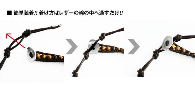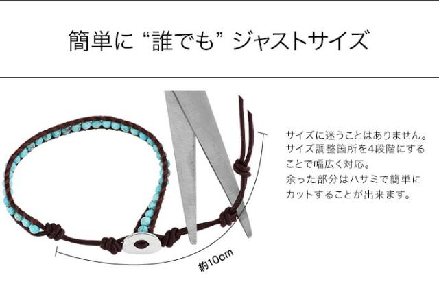 説明 | 重ね付けや単体着けでもいけるおススメのブレスレットです。便利な4段階の調節、余ったレザーはハサミでカット出来男女を問わず使用可能です。 |