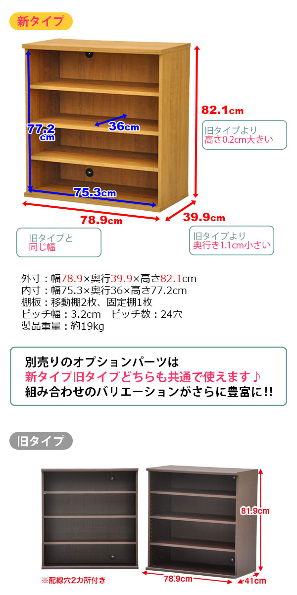 ↓この「基本ユニット9080」に取付可能なオプションはこちら ・引き出し ・木扉(高さ38.2cm)×2枚必要です ・木扉(高さ76.6cm)×2枚必要です ・ガラス扉(高さ38.2cm)×2枚必要です ・ガラス扉(高さ76.6cm)×2枚必要です ・追加棚板 ※オプション取り付けに必要な部品は各オプションに同梱されています。 |
