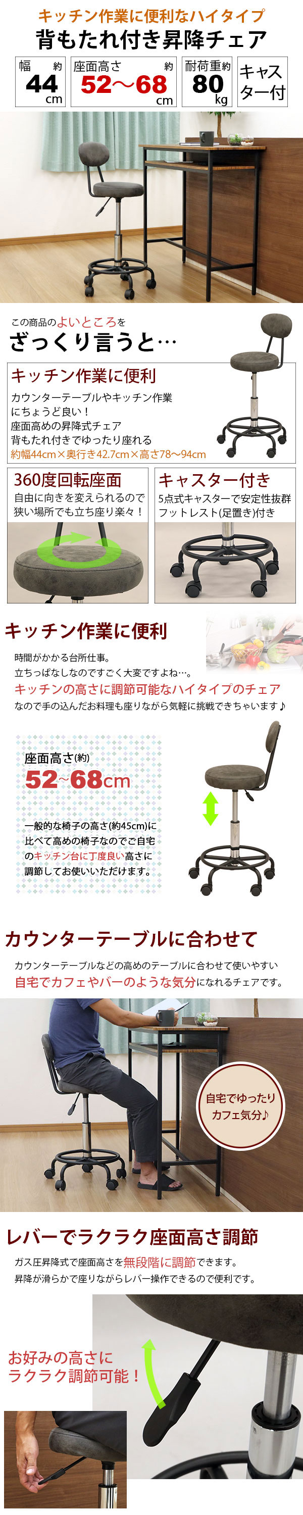 キッチンで使えるキャスターチェア昇降式の詳細