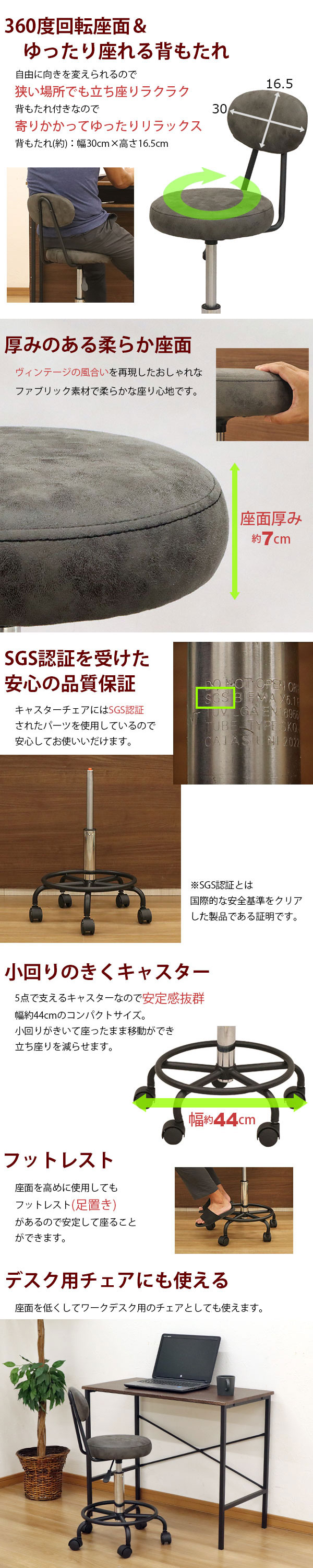 ・座面高さ(約)52〜68cm 一般的な椅子の高さ(約45cm)に比べて高めの椅子なので、ご自宅のキッチン台に丁度良い高さに調節してお使いいただけます。 ・レバーでラクラク座面高さ調節 ガス圧昇降式で座面高さを無段階に調節できます。 昇降が滑らかで座りながらレバー操作できるので便利です。 お好みの高さにラクラク調節可能! ・360度回転座面&ゆったり座れる背もたれ 自由に向きを変えられるので狭い場所でも立ち座りラクラク 背もたれ付きなので寄りかかってゆったりリラックス 背もたれ(約):幅30cm×高さ16.5cm ・厚みのある柔らか座面 ヴィンテージの風合いを再現したおしゃれなファブリック素材で柔らかな座り心地です。 ・SGS認証を受けた安心の品質保証 キャスターチェアにはSGS認証されたパーツを使用しているので安心してお使いいだけます。 ※SGS認証とは 国際的な安全基準をクリアした製品である証明です。 ・小回りのきくキャスター 5点で支えるキャスターなので安定感抜群幅約44cmのコンパクトサイズ。 小回りがきいて座ったまま移動ができ立ち座りを減らせます。 ・フットレスト 座面を高めに使用してもフットレスト(足置き)があるので安定して座ることができます。 |