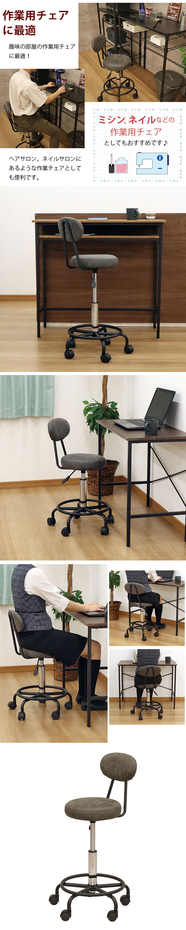 ・キッチン作業に便利 時間がかかる台所仕事。 立ちっぱなしなのですごく大変ですよね…。 キッチンの高さに調節可能なハイタイプのチェアなので、手の込んだお料理も座りながら気軽に挑戦できちゃいます♪ ・カウンターテーブルに合わせて カウンターテーブルなどの高めのテーブルに合わせて使いやすい 自宅でカフェやバーのような気分になれるチェアです。 自宅でゆったりカフェ気分♪ ・デスク用チェアにも使える 座面を低くしてワークデスク用のチェアとしても使えます。 ・作業用チェアに最適 ミシン、ネイルなどの作業用チェアとしてもおすすめです♪ ヘアサロン、ネイルサロンにあるような作業チェアとしても便利です。 |