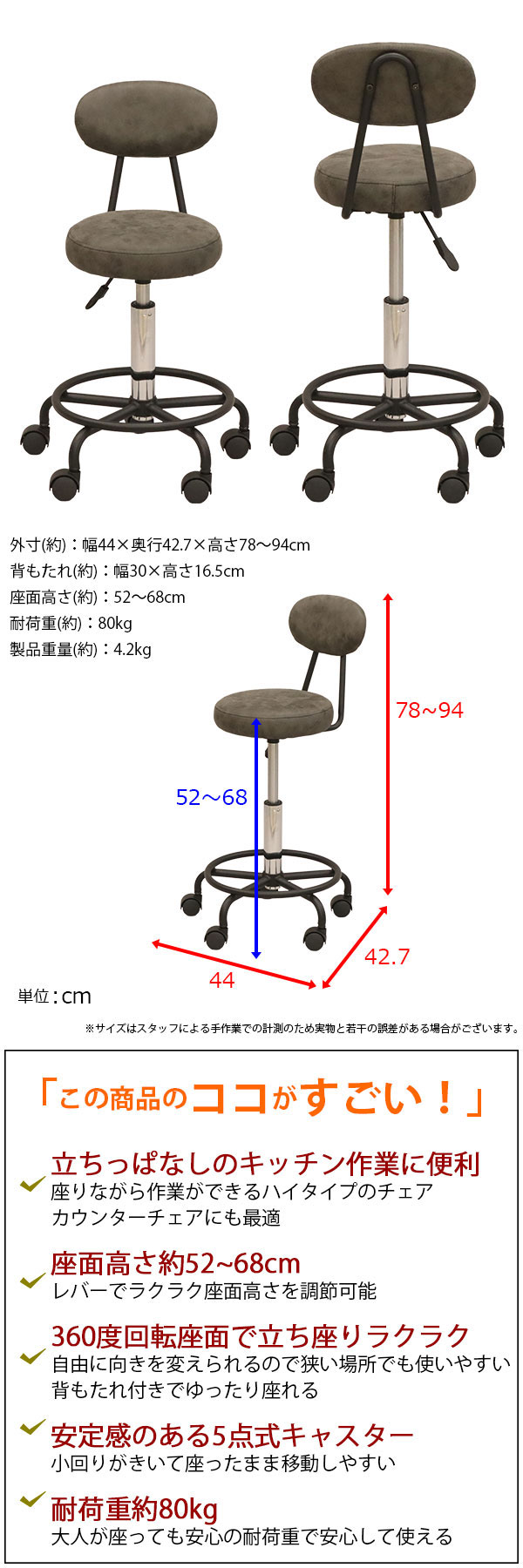 外寸(約):幅44×奥行42.7×高さ78〜94cm 背もたれ(約):幅30×高さ16.5cm 座面高さ(約):52〜68cm |