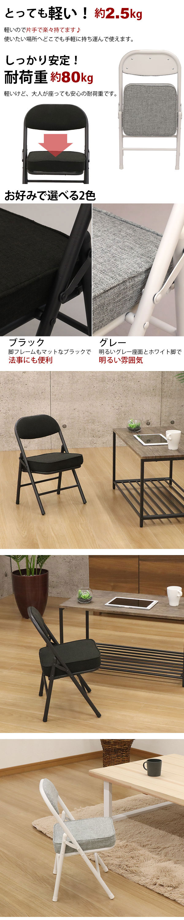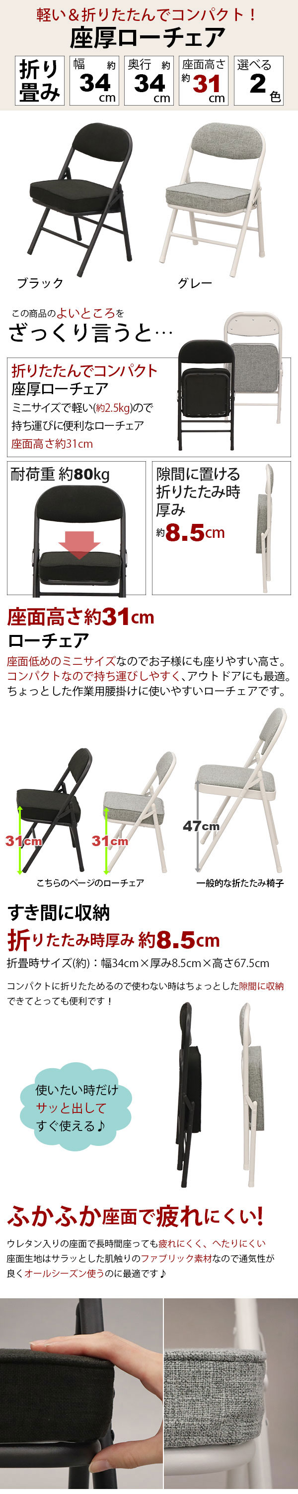 幼稚園や保育園、保育室、小さな子どもがいるご家庭などに最適。 ※小さな子どもたちだけでの使用はおやめください。指などを挟まないよう周囲の大人の方が十分にご注意ください。 児童館や公民館などでも使用されています。 軽量で持ち運びが楽々なので運動会やアウトドアなどの屋外利用も可能です。 ※屋外でのご利用の際には雨にぬれないようご注意ください。 ちょっとした腰掛けや作業用の補助いすにも便利なチェアーです。 座面高さ約31cm ローチェア 座面低めのミニサイズなのでお子様にも座りやすい高さ。 コンパクトなので持ち運びしやすく、アウトドアにも最適。 ちょっとした作業用腰掛けに使いやすいローチェアです。 お好みで選べる2色 ブラック 脚フレームもマットなブラックで法事にも便利 グレー 明るいグレー座面とホワイト脚で明るい雰囲気 |
