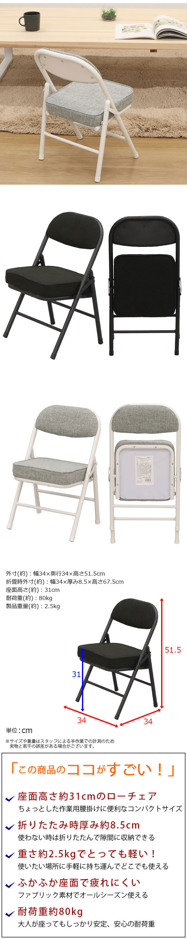 外寸:幅34cm 奥行き34cm 高さ51.5cm ※座面高さ31cm 折りたたみ時:幅34cm 高さ67.5cm 厚み8.5cm |