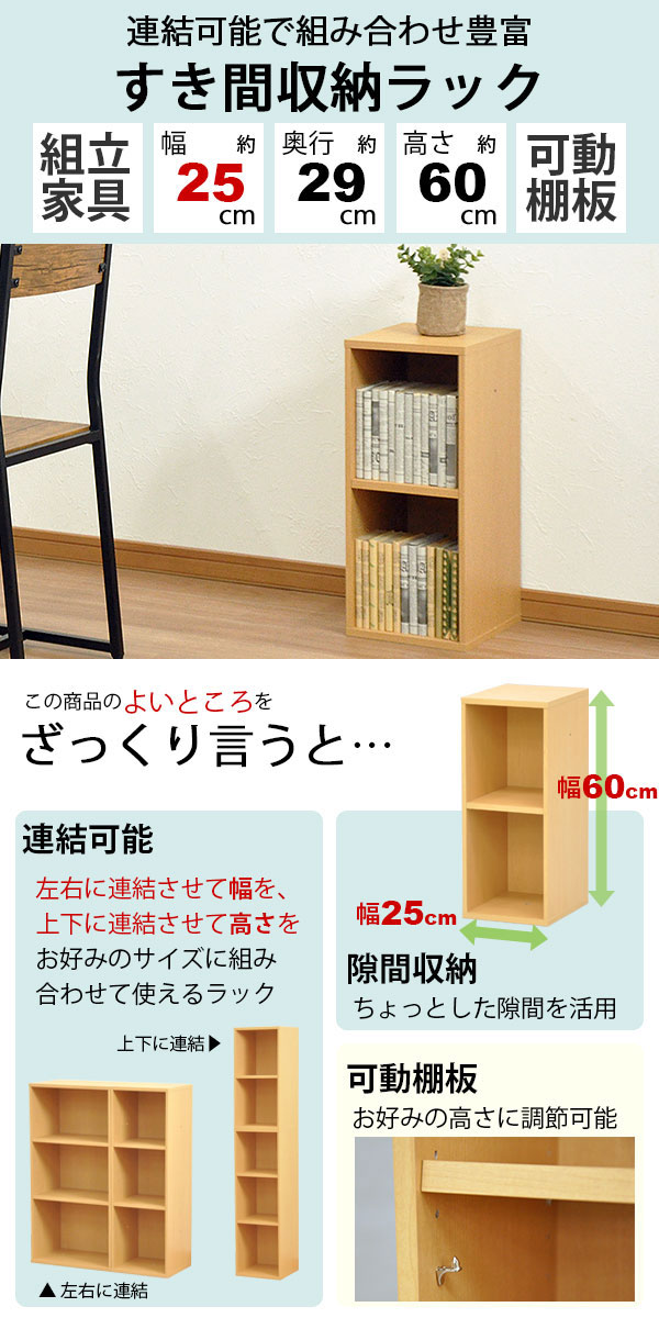 商品名:すき間収納棚 幅25cm (約)奥行30cm 高さ60cm カラーボックス 2段 奥行29.4cm(約奥行30cm) 本棚 漫画収納 コミック収納 キッチン 洗面所 脱衣所 玄関 リビング すきま収納 隙間収納 多目的ラック 多目的棚 スリムラック スリム収納 書棚 シンプル ナチュラル 連結可能NPG-6025