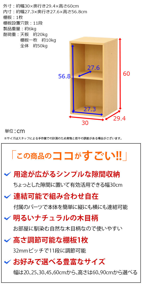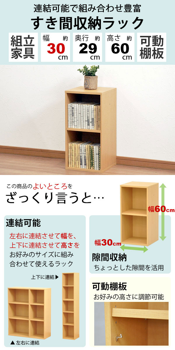 商品名:すき間収納棚 幅30cm (約)奥行30cm 高さ60cm カラーボックス 2段 奥行29.4cm(約奥行30cm) 本棚 漫画収納 コミック収納 キッチン 洗面所 脱衣所 玄関 リビング すきま収納 隙間収納 多目的ラック 多目的棚 スリムラック スリム収納 書棚 シンプル ナチュラル 連結可能NPG-6030