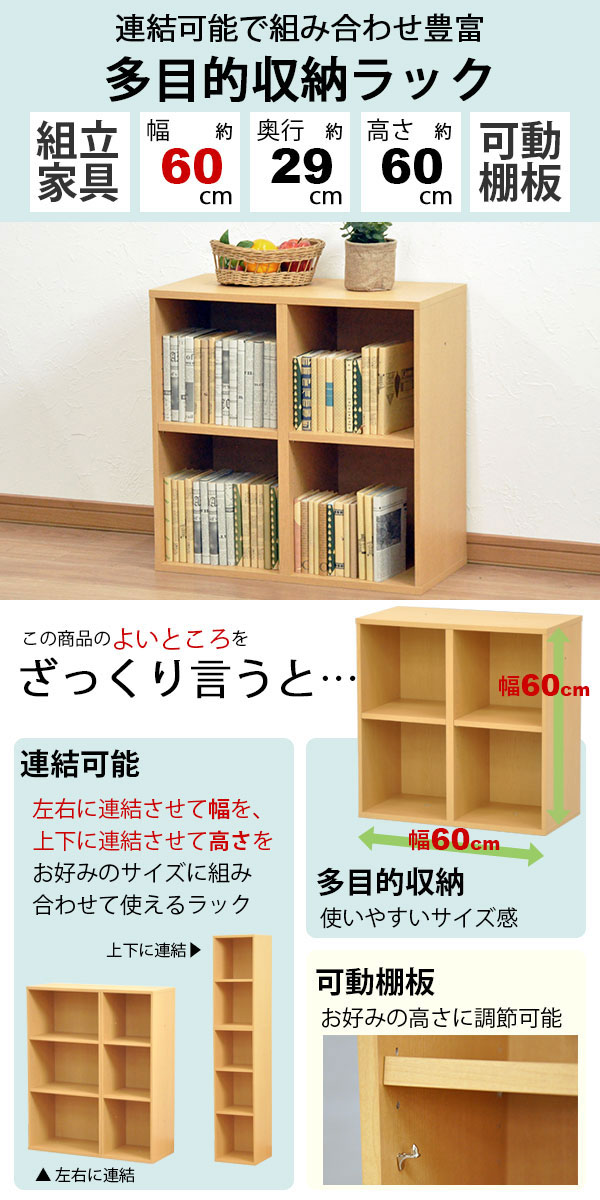 左右に連結させて幅を、上下に連結させて高さをお好みのサイズに組み合わせて使えるラック