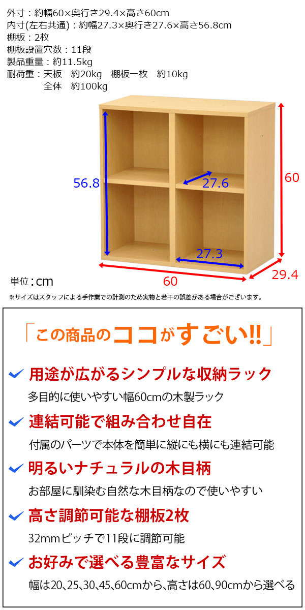 商品名:すき間収納棚 幅60cm (約)奥行30cm 高さ60cm カラーボックス 2段 奥行29.4cm(約奥行30cm) 本棚 漫画収納 コミック収納 キッチン 洗面所 脱衣所 玄関 リビング すきま収納 隙間収納 多目的ラック 多目的棚 スリムラック スリム収納 書棚 シンプル ナチュラル 連結可能NPG-6060