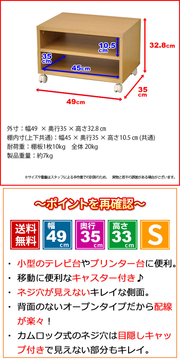 | 商品名: プリンター台 テレビ台 キャスター付き 50幅 おしゃれ プリンターラック TV台 小さい ローボード サイドワゴン 3段 オープンラック サイドテーブル 低い 頑丈 幅49cm 奥行35cm 高さ32.8cm 木製 AVラック レコーダー デスク下 一人暮らし ダークブラウン ナチュラル 家具 インテリア 収納家具 収納 棚 TV台 プリンター置き プリンターワゴン コピー機 複合機 FAX 移動 できる 収納 テレビラック テレビボード TVボード ミニテレビ台 リビングボード TVラック AVボード 小物収納 収納ラック サイドラック 押入れ収納 ウッドラック オープン棚 CD DVD ブルーレイ ゲーム機 ノートPC オーディオ パソコン台 モニター台 ナイトテーブル マルチラック フリーラック ソファサイド ソファ横 ベッドサイド ベッド横 デスクサイド デスク横 テーブルの下に置ける コンパクト 省スペース 丈夫 新生活 ワンルーム 子供部屋 寝室 リビング 書斎 オフィス 店舗 シンプル かわいい 木目調 商品種別: テレビ台(TV台)、テレビボード(TVボード)、テレビラック(TVラック)、AVボード(AVラック)、ローボード、オープンラック、プリンター台、フリーラック |