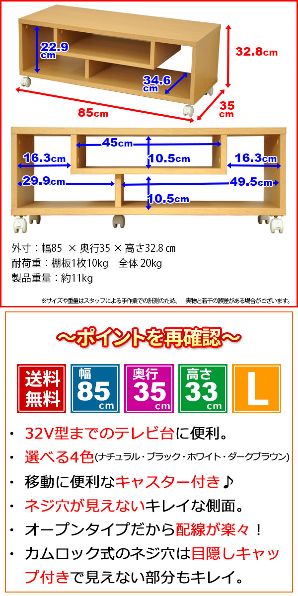 | 外寸:幅85cm 奥行き35cm 高さ32.8cm 内寸(上部):幅45cm 奥行き34.6cm 高さ10.5cm 内寸(L字大):幅16.3cm/49.5cm 奥行き34.6cm 高さ22.9cm/10.5cm 内寸(L字小):幅16.3cm/29.9cm 奥行き34.6cm 高さ22.9cm/10.5cm ※キャスター取り外し時の高さ:約27.2cm |