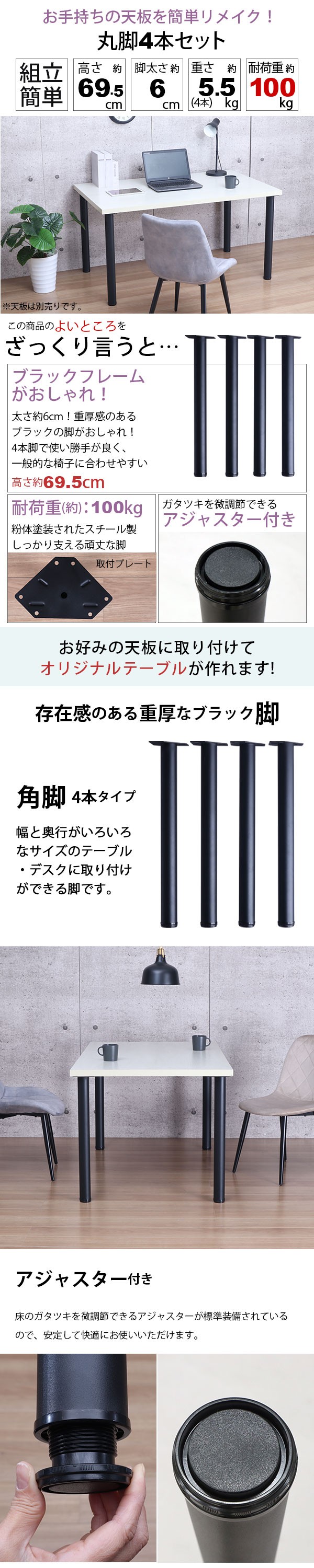 テーブル 脚 パーツ DIY 高さ69.5cm(約高さ70cm) 4本セット ブラック 黒 丸脚 テーブル脚 おしゃれ 頑丈 カフェ風 テーブル 脚のみ 机の脚 在宅ワーク デスク 脚 ダイニングテーブル パソコンデスク スチール脚 付け替え 取り替え リメイク テーブル脚のみ アジャスター付き