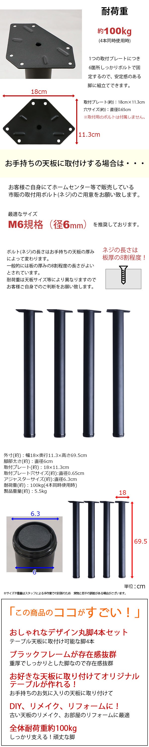 耐荷重は天板サイズ等により異なりますのでお客様ご自身でのご判断をお願い致します。ネジの長さは板厚の8割程度!