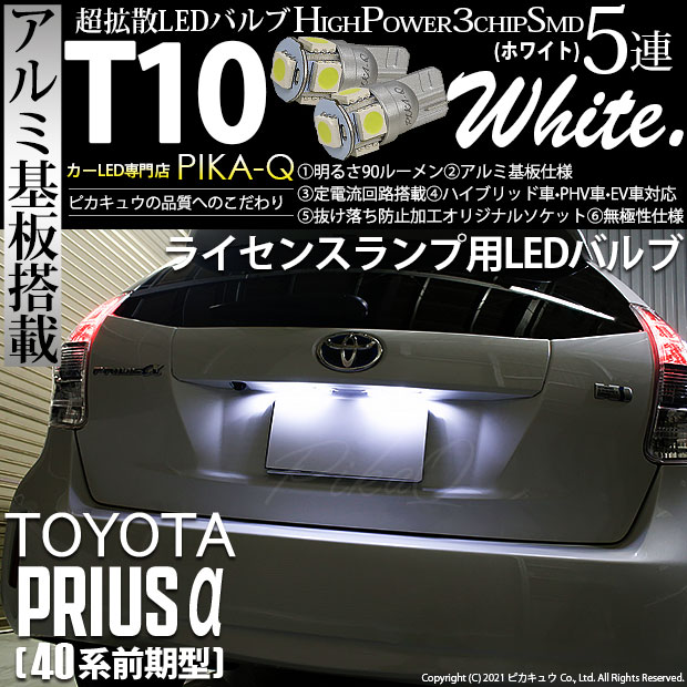 ピカキュウ,LED専門店,LEDバルブ,LED,SMD,T10,W5W,T10 HIGH POWER 3CHIP SMD 5連ウェッジシングル球,アルミ基板,90lm,長持ち,ホワイト,ライセンスランプ,番号灯,トヨタ,40系プリウスアルファ,プリウスα,TOYOTA,PRIUSα,ZVW40W,ZVW41W,前期,
