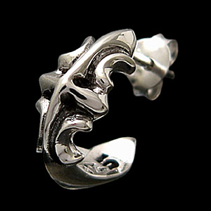 三日月とクロスを融合させたデザインのシルバーピアス。それらには意味がある。「CoexisT」…共存するという意味のこの言葉の頭文字は三日月を表す「C」、そして最後の文字は十字架の「T」。世界の人たちが平和で、皆一緒に共存できたら…という思いが込められたその言葉をモチーフにした月とクロスのピアスです。実はフレア模様も隠されたこのピアスですが、シルバーの柔らかで少しいびつな曲線がハードになりすぎなずに使えるお気に入りの一品へとなりそうです。■長さ:1.5cm 幅:0.7cm 厚み:0.36cm 重さ:1.9g (バラで計測)■シルバー925