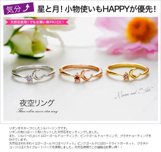 月と星をモチーフにしたシルバーリングです。小さな星にはカットした天然石をセッティングしました。また、シルバーの上にイエローゴールドコーティング、ピンクゴールドコーティング、プラチナコーティングをかけています。天然石はそれぞれイエローゴールドにはアメジスト。ピンクゴールドにはガーネット、プラチナコートにはタンザナイトを使用しました。天然石使用でこの価格はお買い得!!■幅:0.47cm 厚み:0.2cm 重さ:1.2g (9号計測の場合)■シルバー925■アメジスト/ガーネット/タンザナイト[シルバーアクセサリー/リング・指輪]≪サイズ≫ 07号 09号 11号 13号≪c-code≫ ゴールド/ピンクゴールド/レッド/ブルー/パープル