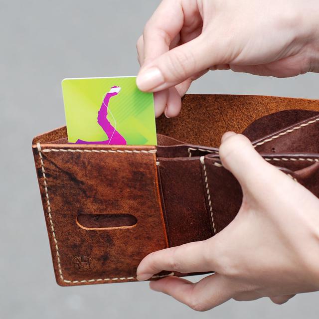 D Walletの特徴は、二通りの使い方が選べるところ。基本はコンパクトな二つ折り財布として。コインポケットの差し込み部分を抜き取ると、小銭入れと二つ折りタイプの札入れ(小銭入れなし)の二つに分かれます。普段は電子マネーが中心で、予備としてのコインを携帯する場合には、後者のスタイルがぴったりでしょう。二つを合わせて使うとき、カード収納の窓からブランドネームの刻印が見える仕掛けは、リティスタならではお洒落な演出です。札入れスペースは、中に小さな羽根のような二枚の仕切りが付いていて、お札を細かく整理できるようになっています。小銭入れはフラップ付きのボックス型。差し込み部分のミニポケットには切符やメモなどを仕舞うことができます。カードポケットは左が窓付きで、右はスリットタイプの三段。また、左上部には縦入れで本体を閉じたままでも出し入れできるカード収納もあって、ここには複数枚のカードが重ねて入ります。