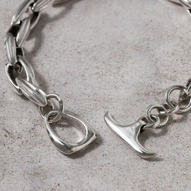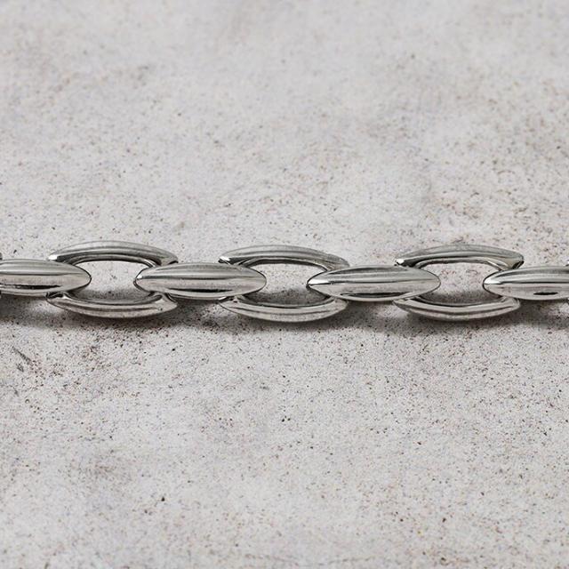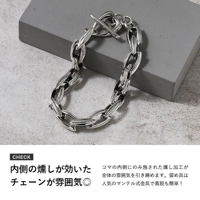 説明 | 流れるようなしなやかなラインが手元をスッキリと見せてくれるブレスレット。 シンプルなデザインですがしっかりとしたボリュームのあるフォルムです。 コマの内側にのみ施された燻し加工が全体の雰囲気を引き締めます。 |