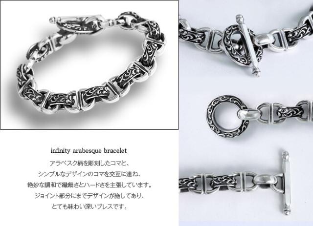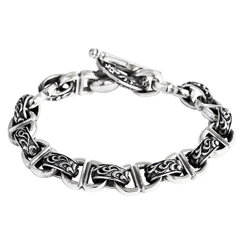 アンカーチェーンを思わせる楕円コマに、アラベスク(唐草)彫刻コマとシンプルなコマを交互に組み合わせたメンズブレスレット。