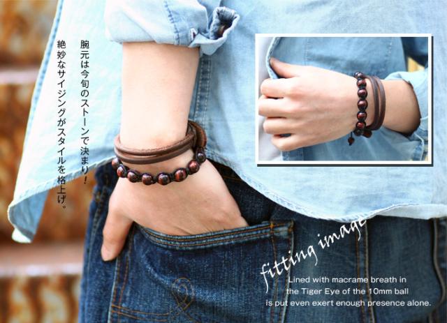 10mm球のタイガーアイをマクラメ編みで連ねたブレスは単体着けでも十分に存在感を発揮。神秘的な天然石と、親しみやすく大人っぽいデザインが魅力的です。気負わず着けれるのでマストアイテムになること間違いなしです。