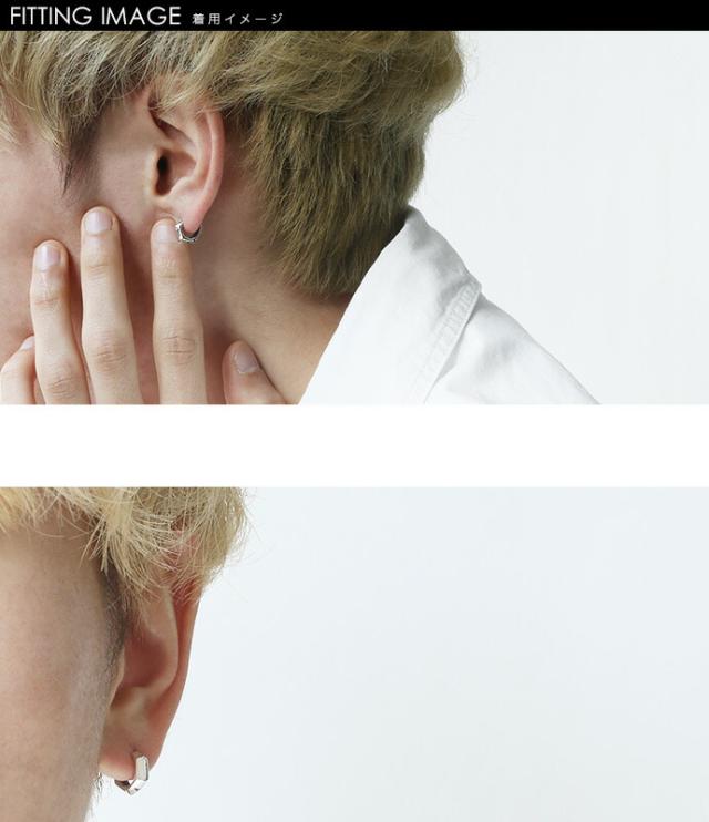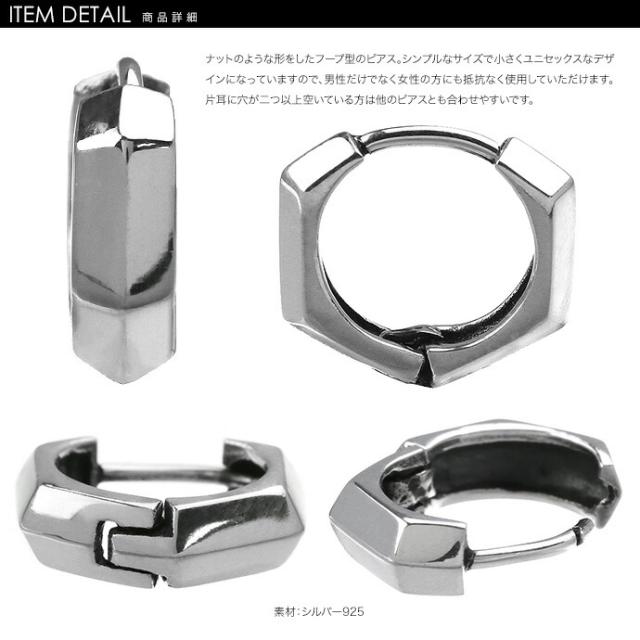 ナットのような形をしたフープ型のピアス。シンプルでサイズも小さくユニセックスなデザインになっていますので女性の方にも抵抗なく使用していただけます。片耳に穴が二つ以上空いている人にはほかのピアスにとても合わせやすい一品です。