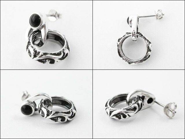 スクロールのリングとオニキスを使用したドロップ型のピアス。燻しのかかったスクロールリングとオニキスの相性はとてもよく、大きめのサイズで存在感抜群のピアスです。