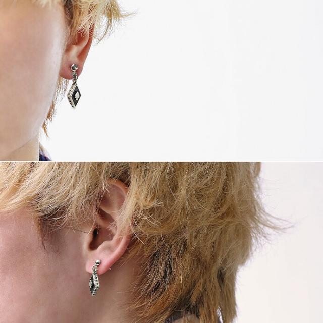 ダイヤ型のブラック台座の中央にスペードマークを配置。ダイヤの側面にはトランプカードの柄のスペード、ハート、クローバー、ダイヤを彫りこみました。それぞれの形がモチーフのピアスはよく見かけますが、トランプ柄が贅沢に全て入ったピアスは珍しいですよ。ちっちゃな中にも細部までこだわった、愛らしいデザインのドロップピアス。耳元で動くたびに揺れるので、かわいいし、おしゃれ感もぐーんっとアップです。