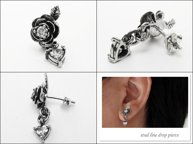 ローズ(薔薇)を見事に彫金したシルバーピアス。薔薇の下にはジルコニアが垂れ下がっており奇麗なハート型にカットされています。ハンドメイドだからこそ可能な秀才ピアスです。
