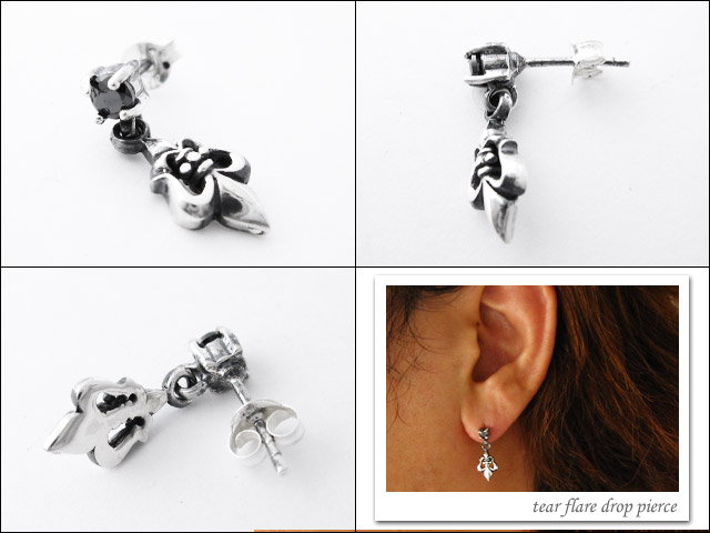 キュービックジルコニアを頭にセットし、フレアモチーフをぶら下げたドロップピアス。強めの燻し加工により重厚感のあるフォルムに仕上がっていて存在感のあるピアスです。