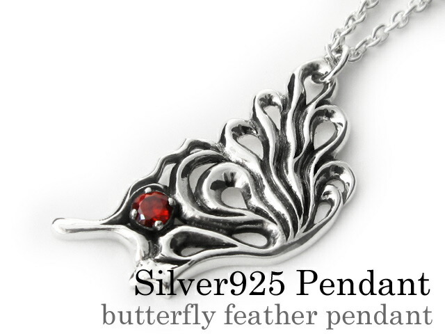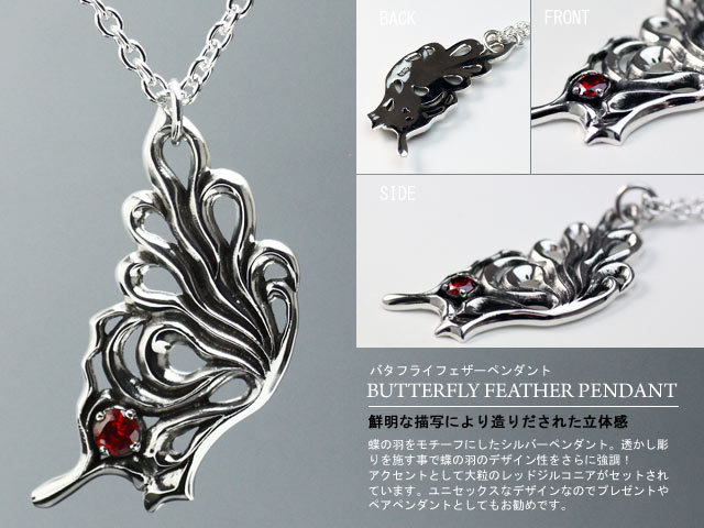 蝶の羽をモチーフにしたシルバーペンダント。透かし彫りを施す事で蝶の羽のデザイン性をさらに強調!アクセントとして大粒のレッドジルコニアがセットされています。ユニセックスなデザインなのでプレゼントやペアペンダントとしてもお勧めです。