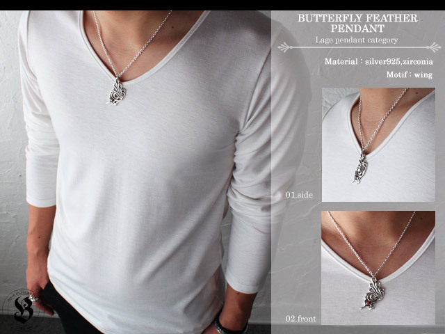 ■商品名:バタフライフェザーペンダント ネックレス メンズ (3mmアズキチェーン付きセット) シルバー925 アクセサリー ウイング フェザー 羽 翼 シルバーペンダント
